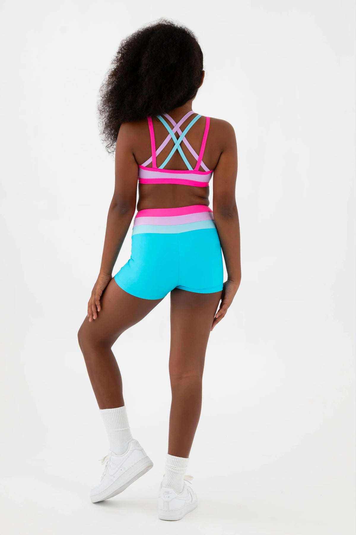 Brighten every training session with the Sweet Pea Short — a feel-good design made to move with you. Styled in a bold and playful pink, blue, and purple colour-block, these shorts are all about fun and function. The wide waistband sits comfortably above the belly button, with an elasticated top edge to keep everything in place—no riding up, just smooth, secure support.